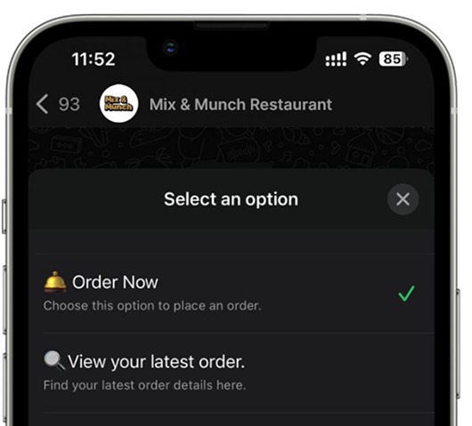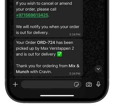 Set up your official WhatsApp Business profile and link it to your menu. Customers can view menus, check order history, track deliveries, and get instant replies — all automated.